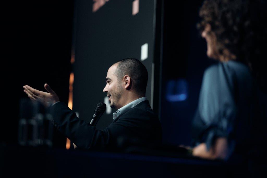 Jordan Samhi smiling at the lectern at the PhD Graduation Day 2023